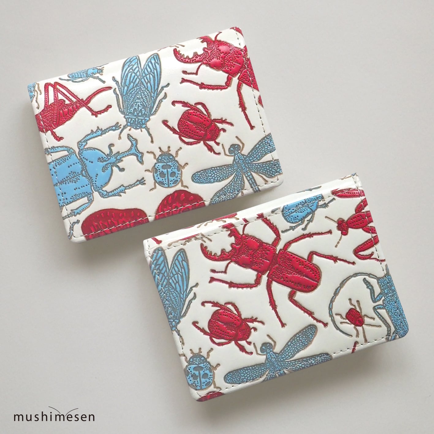 虫アートディレクタームシメセンが日本の昆虫たちを描きデザインしたシリーズの両面小銭入れ(アカ×ミズイロ)です。