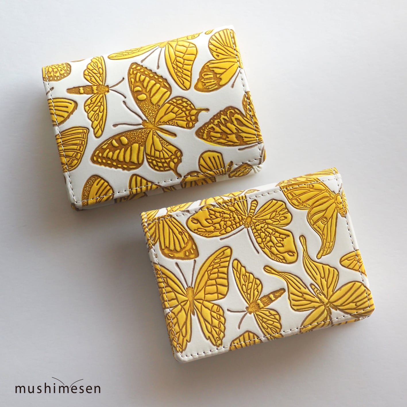 虫アートディレクタームシメセンが蝶を描きデザインした「蝶と蛾の夢」の両面小銭入れ(キイロ)です。