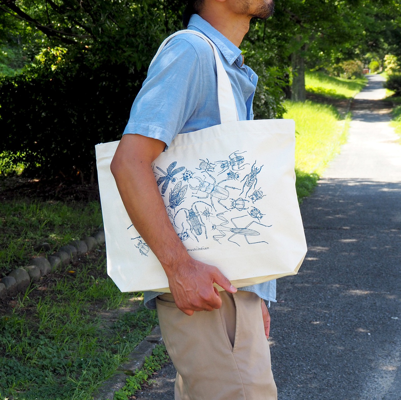 文庫革「日本の昆虫シリーズ」で使用したイラストをリデザインした大きめサイズのトートバッグです。