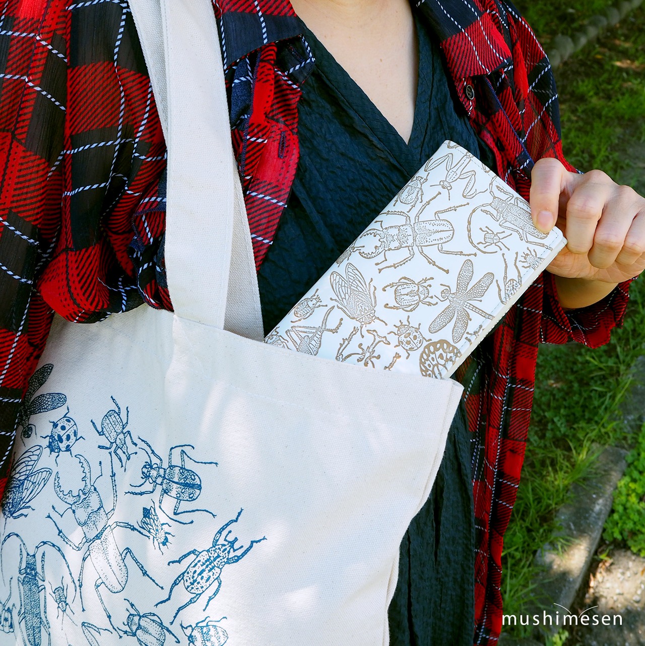 虫アートディレクタームシメセンが日本の昆虫たちを描きデザインしたシリーズの長財布/アバンギャルド彩色ver. mix柄(ミント×ベージュ)です。